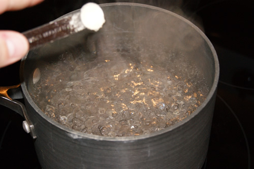 In a 2 1/2 quart pot, bring about 3 cups (720 ml) of water to a boil and turn off the heat. Add ⅛ tsp of yeast nutrient like Fermax containing diammonium phosphate and yeast hulls.
