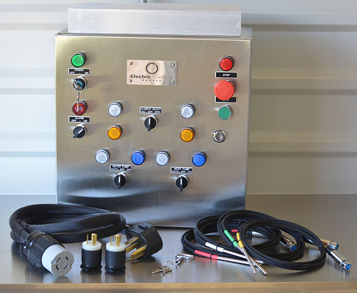 • Hit the ground running with one of our complete control panels. Save your time and energy, and let Electric Brewing Supply help you get a jump on your electric brewery.   Include your wireless network information with your order, and we'll configure the brewery to connect for you.   Due to the custom nature of these, delivery will varyAlways subject to prior orders. Average lead is approx 4-6 weeks, during busier seasons this can stretch to 8. Now available in 220v variants for Europe and Australia Hit the ground running with one of our complete control panels. Save your time and energy, and let Electric Brewing Supply help you get a jump on your electric brewery. Electric Brewing Supply does the work so you don't have to. Featuring a fully configured 30a Control panel, ready to be mounted on the wall and plugged in. Design features independent control of pumps, either by BCS controller or manually. Elements are controlled only by BCS, with a selector switch controlling which element is controlled, for added safety. Have a problem? Wort pumping all over the floor? Forgot a hose? The red mushroom stop button halts all functions, without cutting your brew day short. Specifications: 30a, 240v electric, single phase (for safety, please use GFCI protection) 30a Twist lock power in supply to plain wire end or 4 prong washer/dryer plug, 6 ft wire Embedded Control Concepts BCS-460 installed (some basic configuration available) 2 L6-30 Flanged outlets for 240v Elements upto 5500w , plugs included with panel* 2 L5-15 Flanged outlets for 120v for pumps such as Chugger or March, plugs included with panel 4 temperature probe outlets, Cat5 style, for easy connection 4 4" long temperature probes with Stainless steel 1/4" to 1/2" NPT compression fitting 1 Cat5e Network adapter connection to communicate with network (wireless client available) Key style power switch for secure storage Locking mushroom button stops all power to elements and pumps   What will you need aside from the panel to get going: 4500w or 5500w element in protective enclosure to attach to kettle Available here 30a GFCI protected, single phase 240v electric service to brew area. Electrician installed highly recommended. 1-2 Pumps with plugs changed to twist locking L5-15 plug. Plugs are provided in package Kettles to your liking More on BCS Web-based User Interface The BCS series' user interface is all web based. Monitor and control temperatures and processes on your browser from any computer (or smartphone) anywhere. Check out some Screenshots. Temperature Sensor Inputs The BCS-460 allows up to four independent temperature sensors to be monitored simultaneously. Inputs can be any NTC thermistor based sensor with a 10Kohm ambient reading. Use our sensors, or purchase/build your own. Just set the temperature coefficients that are provided by the sensor manufacturer into the BCS-460, or calculate them based on experimental data. Inputs / Outputs Along with the four temperature sensor inputs, the BCS-460 provides four 5V discrete inputs, and four web-based user inputs. All inputs can trigger controller responses. Six low-current 5V discrete outputs are provided for relay control. Each output can be set to be controlled directly, differentially by a temperature input, or under complete PID control. Affordable expansion cards are available to increase the number of digital inputs and outputs. The Digi16 expansion card adds 12 outputs and 4 inputs. The interface supports upto 4 Digi16 expansion cards, for a total of 54 outputs and 20 inputs! Advanced Data Logging Data is logged internally in the device, and displayed on your browser, or saved as a text file. The BCS-460 supports internal logging of four signals up to 4k samples each. The user can set the frequency of the samples anywhere from 1 second to 6 hours, resulting in trace lengths anywhere from 1.1 hours to 2.8 years long. Programmable Processes A revolutionary State Machine interface allows the user to program with simple and intuitive rules, giving the controller the ability to exhibit extremely complex behavior. The BCS-460 allows up to eight independent processes, each with eight states.  Check out the documentation for programming examples. Open Interface API The control system from ECC utilizes a simple HTTP GET/POST mechanism to control and monitor the unit. The protocol is completely open and documented, allowing users the ability to develop third-party interfaces. Does your application require a unique GUI, or if would like to have your own data logging/graphing application? Want to link multiple BCS systems together and have them all controlled from a unified interface? The possibilities are endless. Check out our Forum to see what the community is offering. Questions? See our Frequently Asked Questions, post in the forum, or contact us directly. http://www.embeddedcc.com/wiki/index.php?title=FAQ http://forum.embeddedcc.com/ http://www.embeddedcc.com/index.php/contacts     This product is intended for experimental home use only. No warranty or guarantee of suitability (express or implied) is given for commercial use of this product.   Product warranties may be revoked if it is determined that product faults are due to misuse, abuse, or improper connection. Buyer agrees that Electric Brewing Supply, LLC shall not be liable for either specific performance or any liability, loss, tampering, abuse, damage, including consequential and incidental damages, arising out of buyer's purchase of the equipment, or any defects in the equipment.