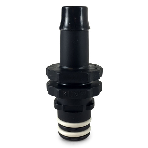 This Kent Systems 3/8" Barb X Male fitting is a male 300 series fitting that works with female 300 series fittings. It is an open-flow connector that is often used in gas or liquid applications.