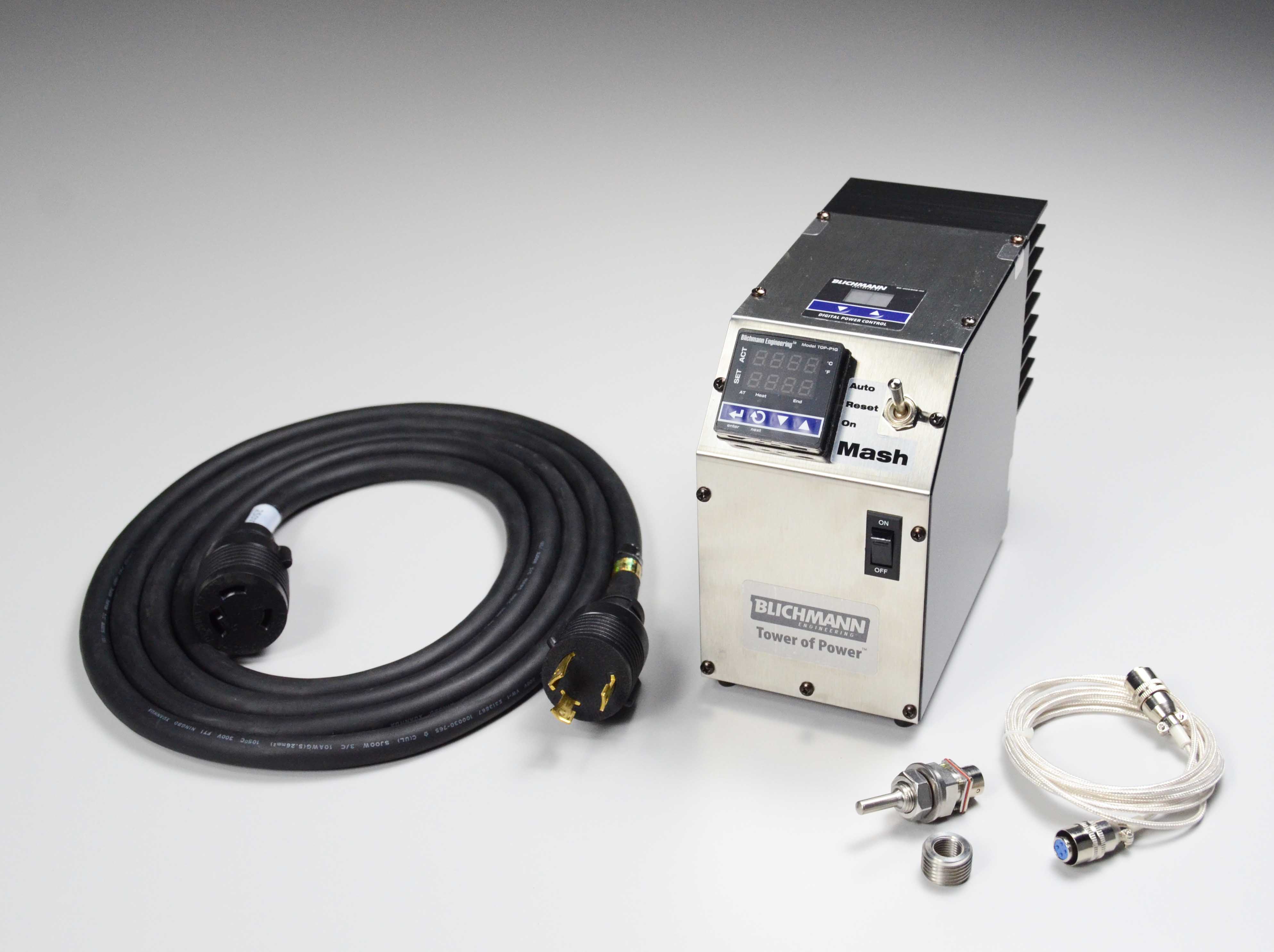 An amazing way to automate a RIMS or HERMS system! Now available in electric, these controllers will work in concert with our suite of equipment options to complete your Blichmann Engineering™ system or act as a freestanding control powerhouse! The Electric TOWER of POWER™ offers superior precision and accuracy. The control module will hold your mash within +/- 0.5°F (1°C). Includes industrial ignition electrode and high quality silicone/carbon fiber ignition wire. Monitors the temperature of your mash tun or HLT (or if you have two Control Modules, both).,,Control Module will include:,,,Class A precision RTD temperature sensor. The sensor can be installed in BrewMometer™ hole in your kettle for an HLT or into any 1/2" NPT fitting with the included adapter bushing.,,,Power control to meter the intensity of the heating element from 0-100%.,,,Optional low level shut off port.,,,Optional Low level kettle switch deactivates heating element to avoid dry firing and potential scorching with element exposed to air. Simply connect low level switch installed in kettle to the TOWER of POWER control module and you are protected from dry firing and potential scorching with element exposed to air. Switch available factory punched for easy installation or as an after purchase add on.,,,Data port for optional remote monitoring and mash-profile programming (unlimited profiles) on your PC (Optional communication cable required).,,,One decal for MASH and one for HLT for appropriate labeling.,,,Compact enclosure of 4.25"W, 7"H, 7"D that is easily integrated into your brew system.,,,Brushed stainless cover and gloss black powder-coated case that will look beautiful for years!,NOTE: Requires 120 v plug for Connectivity.
