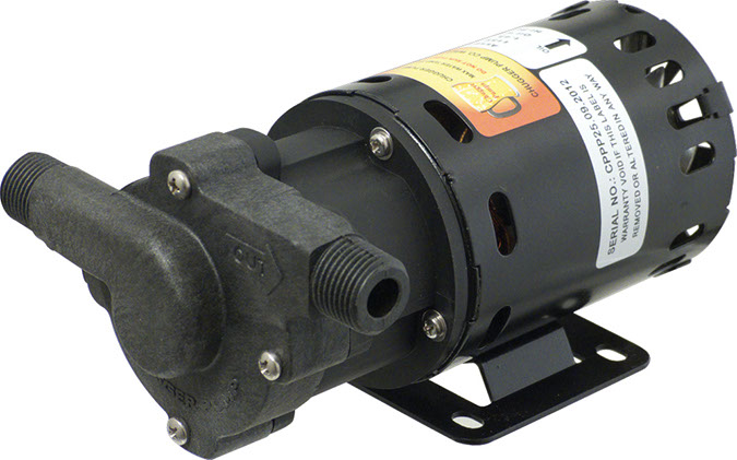 The Chugger lineup of brewing pumps represents a great value for an even better price. These pumps are workhorses in the brewery. Featuring a robust flow rate of 7 gpm, and a magnetic drive designed to handle back-pressure, these pumps are a great addition to any brewing setup! Use this to ease transfers between kettles, cool wort via a counterflow chiller, or recirculate icewater for quicker chilling!,,The Chugger pump has 1/2" mpt inlet and outlet, allowing easy configuration for any application! We recommend setting these pumps up with a ball valve on the outflow side, this way you can throttle down the outgoing flow rate, allowing for more efficient sparges or cooling. The pump head can also be rotated 360° (in 90° intervals) allowing for even more customization.,,Features:,,,Polysulfone Head.,,,Food Grade up to 250° F.,,,1/2" mpt inlet and outlet.,,,High Flow rate of 7 gpm.,,,Max Head 18.9 ft.,,,115v 55" cord and plug attached.,,,50/60 Hz, 1.4 amp,,,1/20 HP, 3500 RPM,,,Rotatable head for custom configuration.,Note: When using silicone tubing, we recommending using a slighlty larger barb than the I.D. of the tubing. This is because silicone tubing tends to have greater pliability than most tubing. For example, when using 1/2" silicone tubing, we recommend our 5/8" barb (H620), to help ensure a better seal!