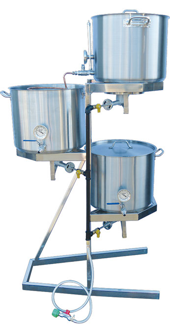 We call this the OG (Original Gravity) because it is our original all-grain gravity system first built in the 1990's. Designed by another OG, retired MoreBeer! partner Regan Dillon, this was the first commercially available all grain system that featured the boil kettle under the hot-liquor tank to save space. It features no pumps or electronics and is centered around the time tested physics of gravity! Fluid flows from the Hot-Liquor tank on top, through the Mash Tun in the middle on into the Boil Kettle on the bottom. The OG comes with 15 gallon kettles which can be used to brew any sized batch between 5 and 10 gallons. ,This is truly the easiest to use all-grain system out there. With nothing electrical to go wrong, simple valves to control flow, easy to view mashtun, and no pumps its just plain easy. Even with a host of digital BrewScultpures and all kinds of other systems at our disposal we still really, really enjoy the simplicity of brewing on our Original Gravity system. And while simplicity rules on this system, you can of course add a pump to recirculate the mash or to push through a counterflow chiller at anytime. ,The frame is made from 304 stainless steel and welded in our metal shop in California. The low profile, Heavy-Duty stainless steel kettles are formed in a mold via the use a punch. This means they are made from a single piece of stainless with no welded seams. These beefy kettles then get an added aluminum layer that is capped with another layer of stainless. The added aluminum helps keep the kettle bottom from scorching and allows for easier cleaning. All the included ball-valves are made from stainless steel. Each kettle comes with a high quality Tel-True thermometer. Just a bullet proof package. ,,,Features:,,,304-Stainless Steel Frame made in USA,,,15 Gallon Heavy Duty Kettles,,,High-Quality Analog Tel-Tru Thermometers on All Kettles,,,Maximizers in All Kettles,,,Piped Propane Gas System with single regulator to run off one propane tank,,,Stainless Ball valves,,,Perforated stainless steel screen in Mashtun,,,MoreBeer! Stainless quick disconnects,,,Silicone tubing included for liquid transfer,,,Glass Sight Gauge on the Hot Liquor Tank,Base Dimensions:,,,54" Tall (Does not include height of kettles),,,25" Deep,,,36" Long,Warning:,,,Not intended for indoor use!